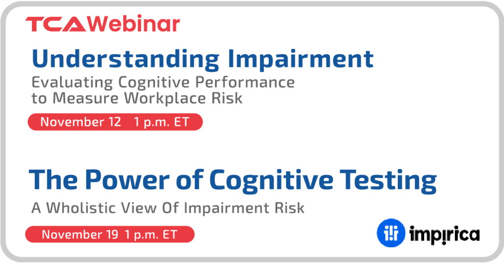 The Truckload Carriers Association (TCA) and Impirica, invite you to participate in a unique, two-part webinar series that explores the cutting-edge in impairment risk assessment for the trucking industry. As we navigate increasing safety and compliance demands, this series offers tools and insights that can make a real difference for your fleet’s safety and operational integrity.